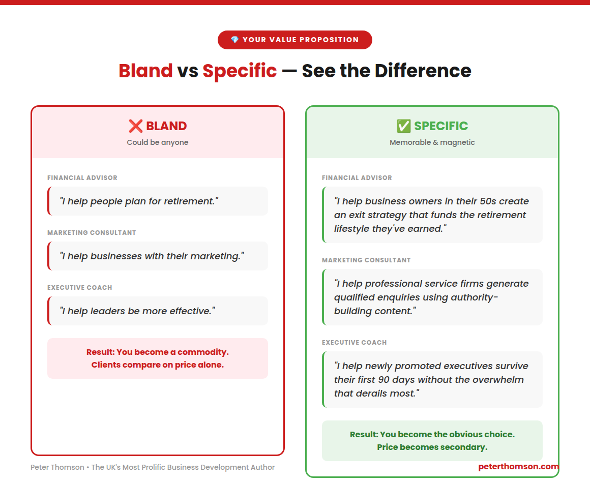 - ✅ Specific: "I help professional service firms generate a steady stream of qualified enquiries without spending money on advertising — using authority-building content that positions them as the obvious choice."