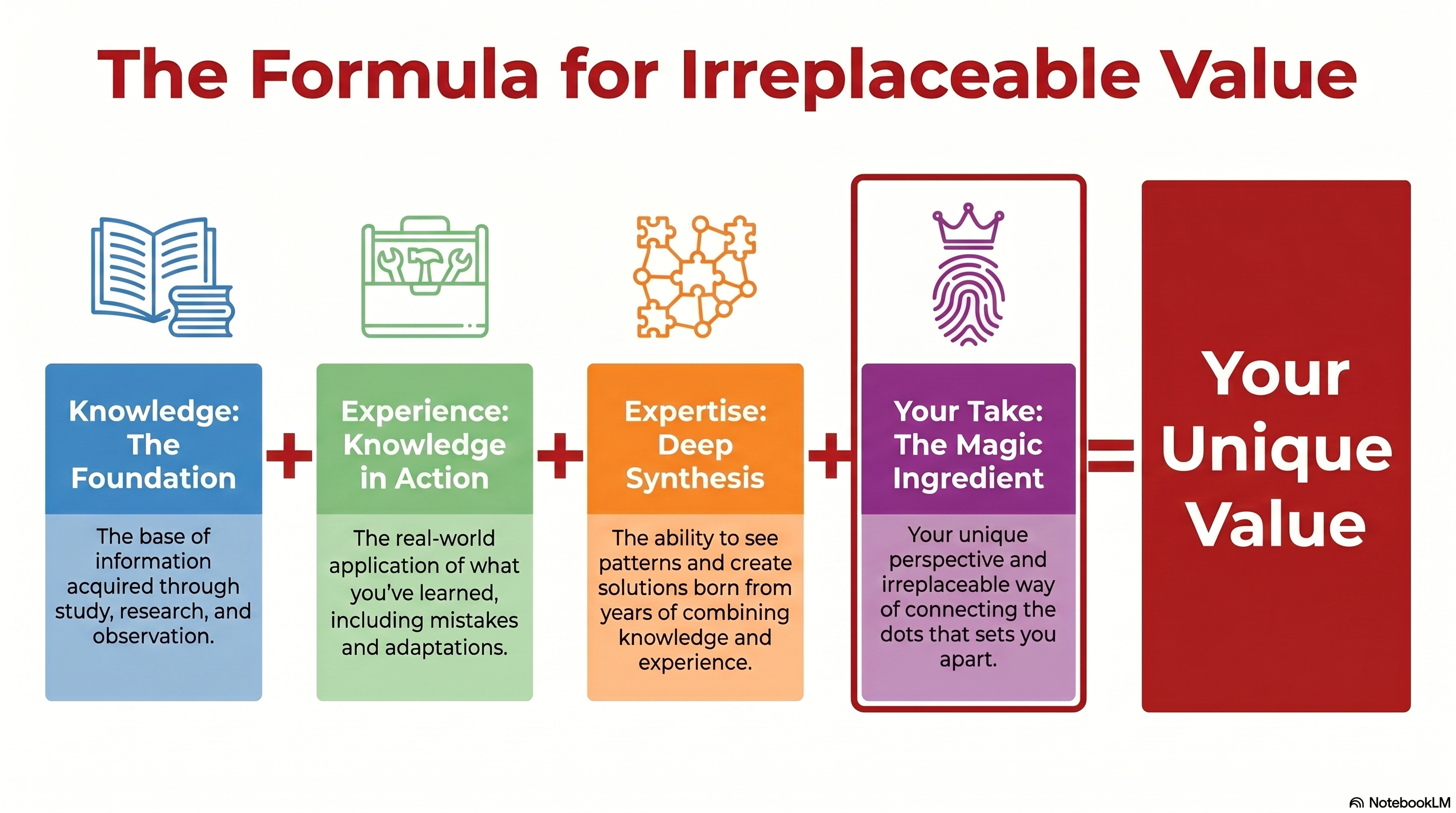 - Your expertise: the deep pattern recognition and creative problem-solving that comes from sustained practice over time