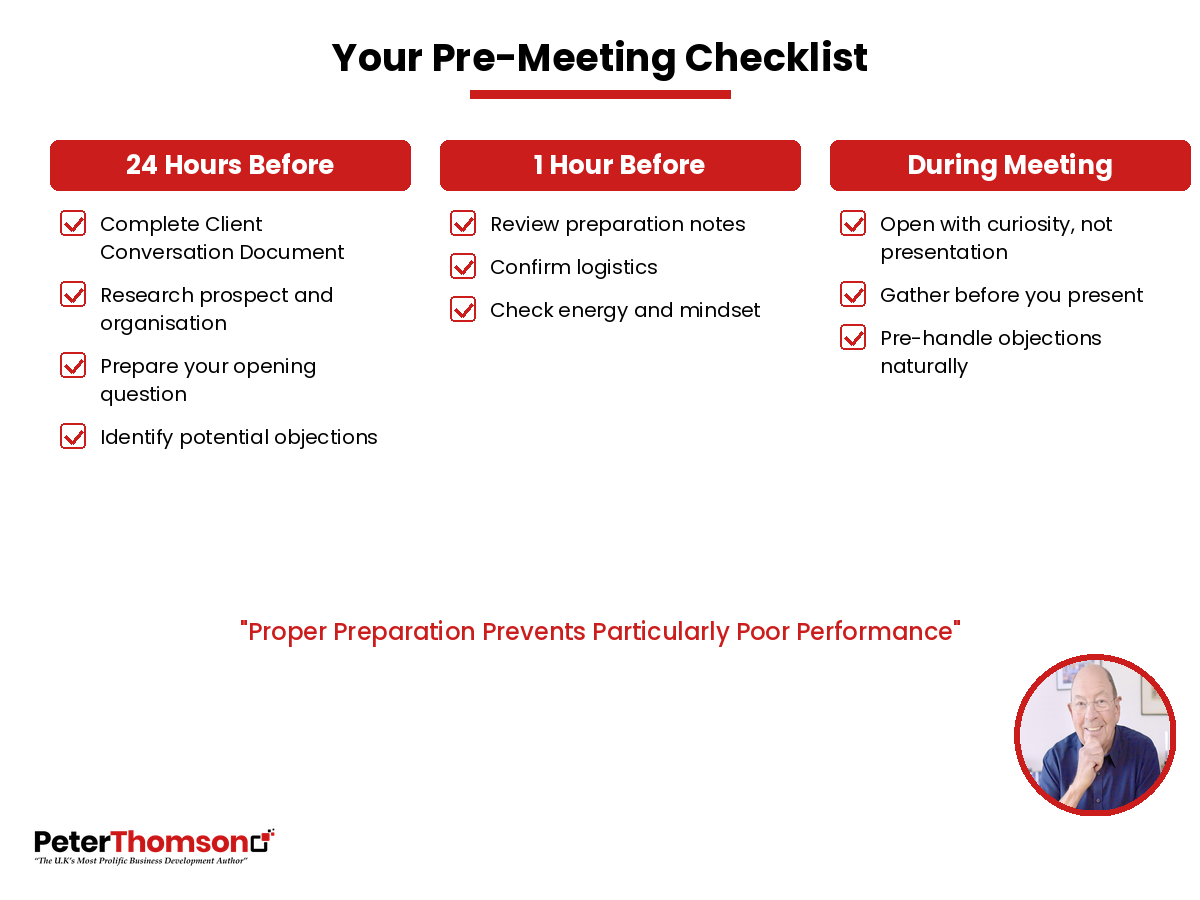 But here's where most professionals get it wrong. They prepare for the meeting they want to have rather than the meeting the client needs to have.
